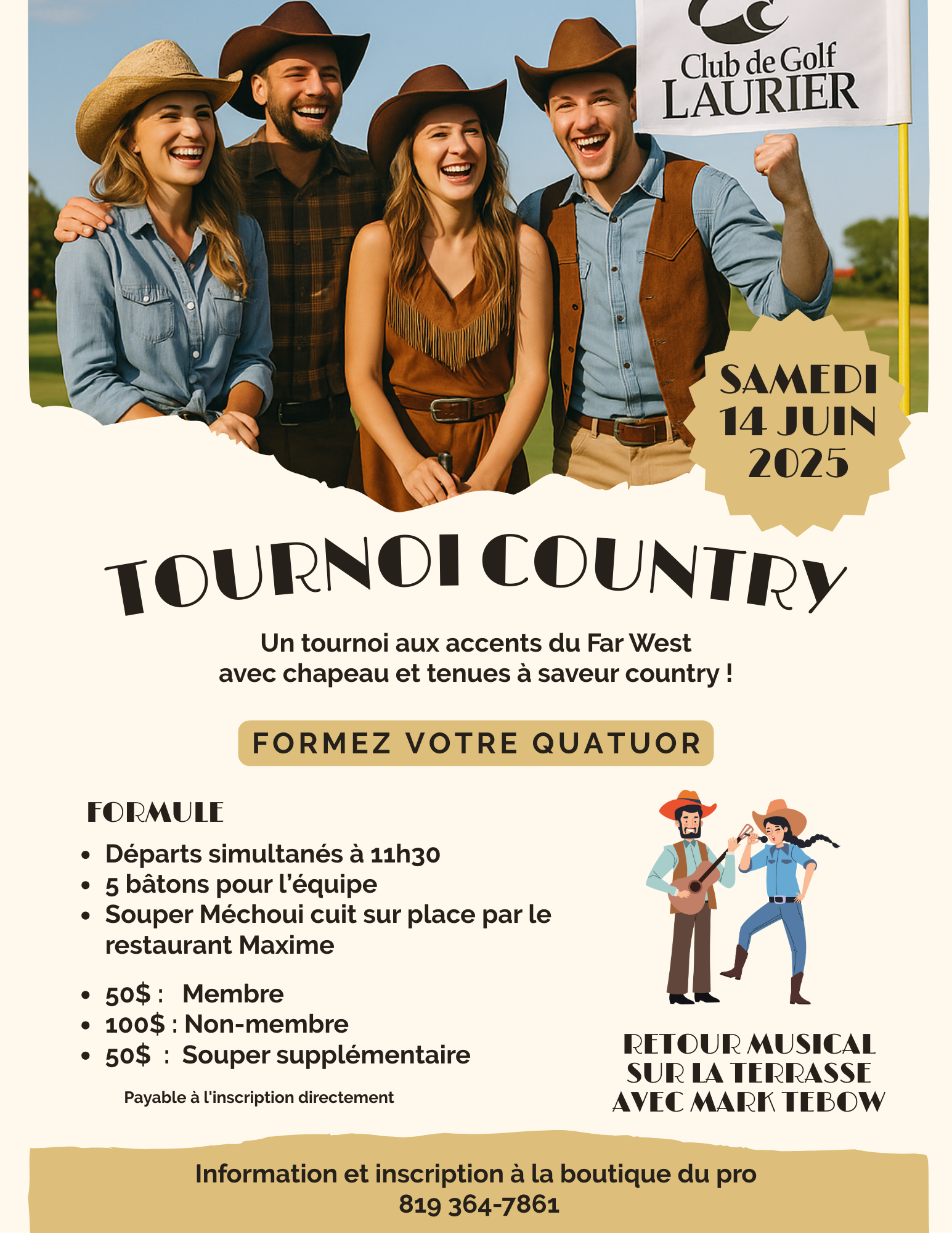 Tournoi Country 🤠🎶 Un événement festif aux accents western avec : ✔️ Formule 5 bâtons par équipe ✔️ Départs simultanés à 11h30 ✔️ Souper méchoui du Restaurant Maxime, cuit sur place ✔️ Retour musical avec Mark Tebow (La Voix) ✔️ Concours « Plus près du trou » au vert #5 Un départ « shotgun » […]