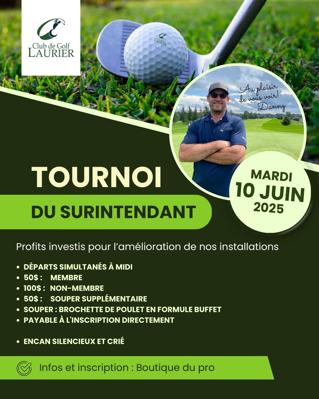 ✔️ Départs simultanés à midi (formule « shotgun ») ✔️ Encan silencieux et crié en soirée ✔️ Souper brochette de poulet en formule buffet ✔️ Profits réinvestis pour améliorer nos installations Un départ « shotgun » à 7h00 sera offert aux membres qui ne participent pas au tournoi. 📍 Inscriptions à la boutique du pro.