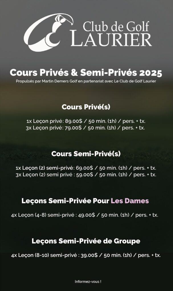 Envie d’améliorer votre élan ou de corriger quelques détails de votre jeu? Notre professionnel, Martin Demers, vous propose des cours personnalisés, dans une ambiance conviviale et sympathique!